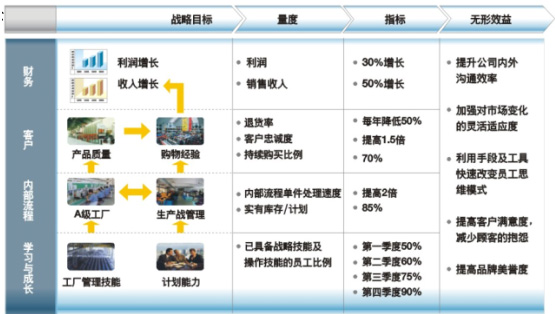 平衡計(jì)分卡自從20世紀(jì)90年代初創(chuàng)立以來,可以作為戰(zhàn)略實(shí)施的工具,它通過構(gòu)建由財(cái)務(wù)、客戶、內(nèi)部業(yè)務(wù)流程、員工學(xué)習(xí)與成長(zhǎng)等相互聯(lián)系的四個(gè)維度組成的績(jī)效評(píng)價(jià)體系,對(duì)企業(yè)組織的戰(zhàn)略適應(yīng)性和當(dāng)今商業(yè)環(huán)境制勝的必要因素進(jìn)行實(shí)時(shí)監(jiān)控,從而克服了傳統(tǒng)以財(cái)務(wù)報(bào)表為基礎(chǔ)的績(jī)效評(píng)價(jià)制度的片面、靜態(tài)與滯后性。平衡計(jì)分卡中的目標(biāo)和評(píng)估指標(biāo)來源于組織戰(zhàn)略,它把企業(yè)的愿景和戰(zhàn)略轉(zhuǎn)化為有形的目標(biāo)和衡量指標(biāo)。藉著財(cái)務(wù)、客戶、內(nèi)部業(yè)務(wù)流程、員工學(xué)習(xí)與成長(zhǎng)這四項(xiàng)指標(biāo)的衡量,企業(yè)得以明確和嚴(yán)謹(jǐn)?shù)氖址▉碓忈屍鋺?zhàn)略。